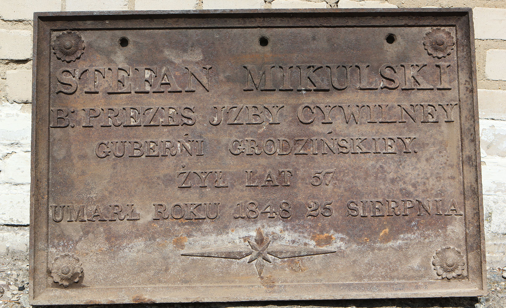 Через полчаса житель аг. Здитово Юрий Горбачук был уже у меня. Из багажника его автомобиля мы вдвоем вытащили эту плиту, навскидку она весила килограммов 60-70. Качественное чугунное литье. Текст на польском гласил: «Стефан Микульский. Бывший председатель избы гражданской Гродненской губернии. Жил 57 лет. Умер 25 августа 1848 года». Обстоятельства обнаружения плиты были самые прозаические: Юрий пошел за грибами в небольшой лесок возле озера Солнечное. Там случайно увидел торчащий из земли кусок металла. Из интереса потянул – оказалось, что это плита. Поразительно, что за все прошедшие десятилетия ее не обнаружили и не сдали в лом местные «охотники» за металлом. Сохранность плиты также отличная.
