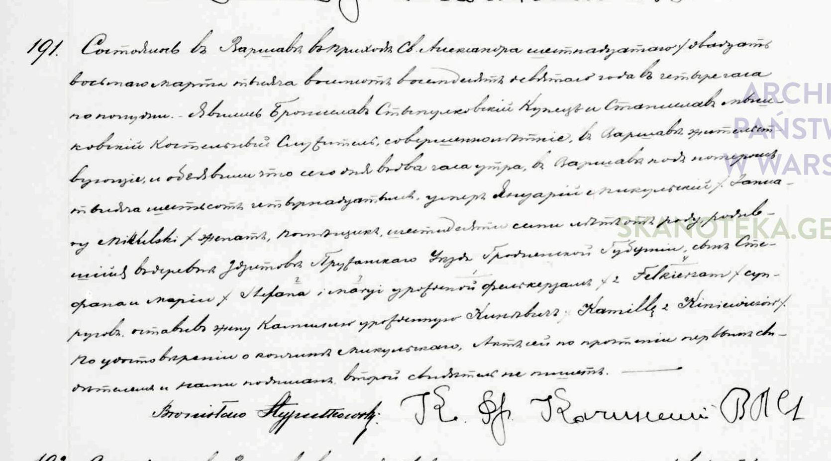 Составлен в Варшаве в приходе Св. Александра шестнадцатого/двадцать восьмого марта тысяча восемьсот восемьдесят девятого года в четыре часа пополудни. Явились Бронислав Стыпулковский, купец, и Станислав Мышковский, костельный служитель, совершеннолетние, в Варшаве жительствующие, и объявили, что сегодня в два часа утра, в Варшаве под номером тысяча шестьсот четырнадцатым умер Януарий Микульский /January Mikulski/. Женат, помещик, шестидесяти семи лет от роду, родившийся в деревне Здитов Пружанского уезда Гродненской губернии, сын Стефана и Марии /Stefana i Maryi/ урожденной Фелькерзам /z Felkierzam/ супругов, оставил жену Камиллю урожденную Киневич /Kamile z Kiniewiczow/.